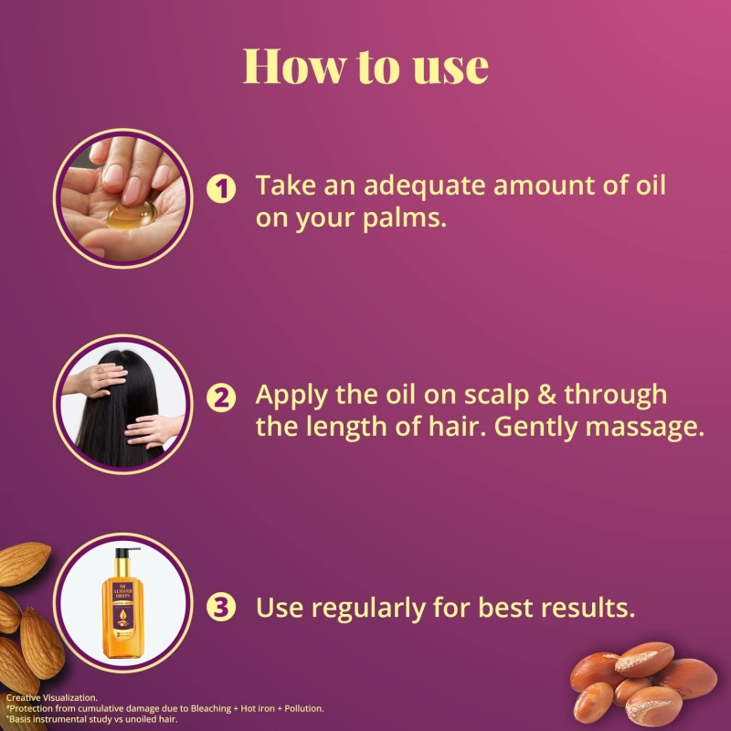 Bajaj Almond Drops Almond + Argan oil protects the hair against cumulative damage from Chemical treatments, Heat styling and Pollution