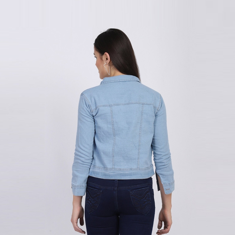Blue solid lightweight denim jacket, has a spread collar, 2 pockets ,has a button closure, three-quarter sleeves, straight hemline, cotton lining.